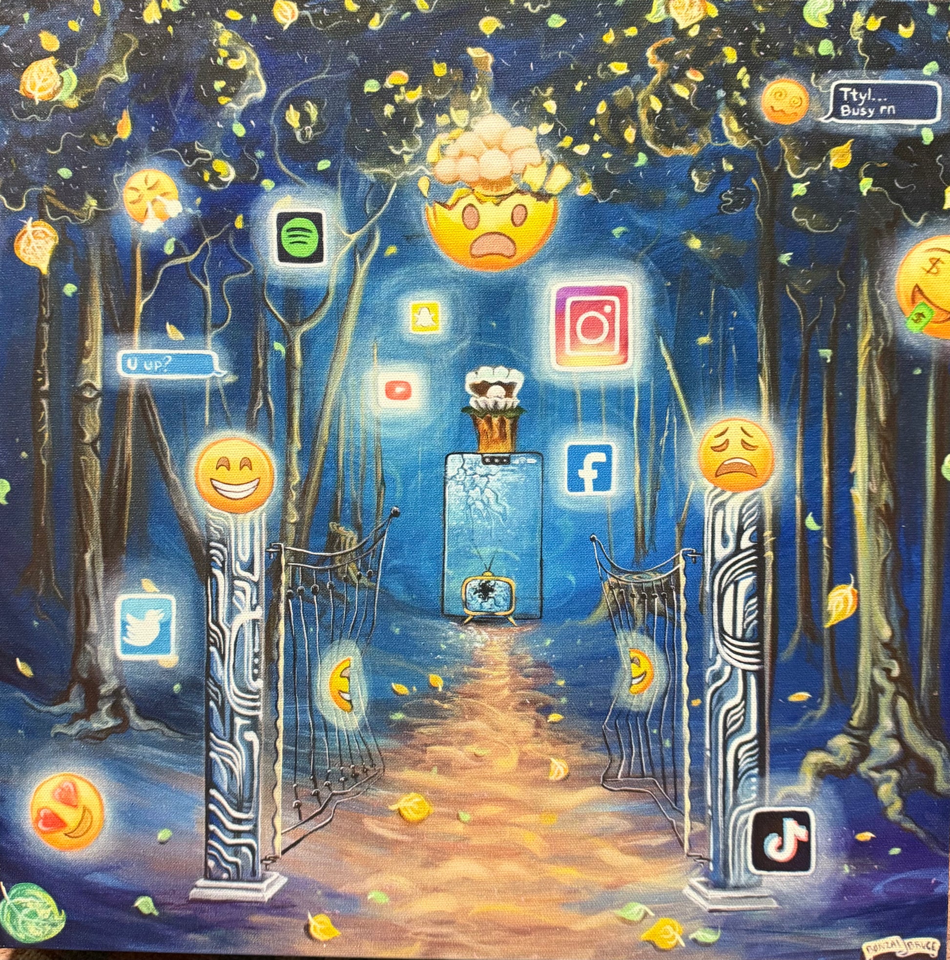 Art is its own language and everyday our language forms and the way we communicate and interact are ever evolving. The Gatekeepers represent those that provide access to platforms and technology that keep us hyper connected, but within the context of this dimly illuminated forest sanctuary, that technology and these platforms have broken down. The pearl of knowledge is an accumulation of our habits and emotional response systems that have been documented through these infrastructures and since those have been broken down in this context, we are taking back what is ours. Owning ourselves again.