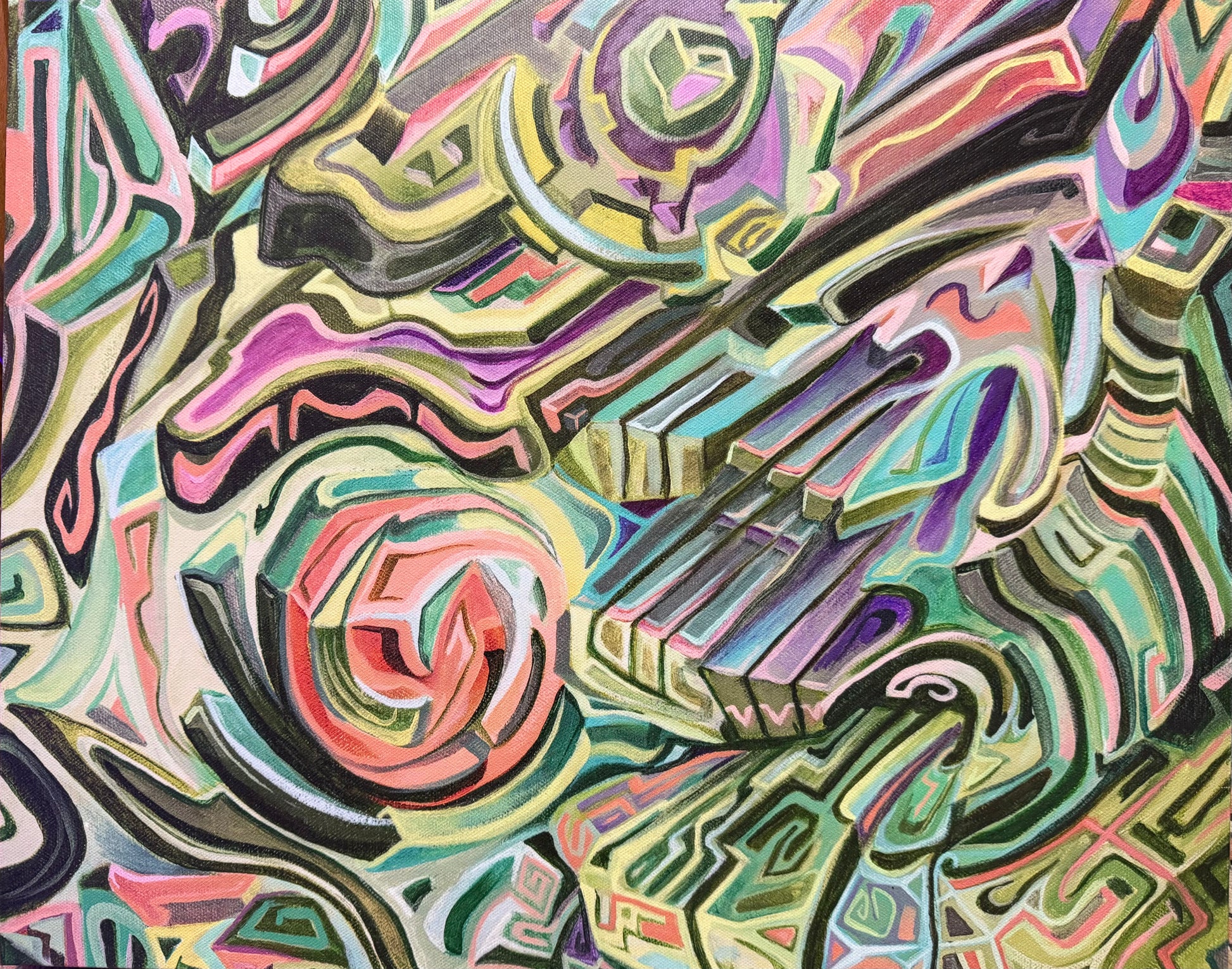 A puzzle piece of an ever evolving series of what I refer to as Shape Escapes. The goal is to create resolution of abstract geometry and an influence of organic flow. Not attempting to paint something specific but to allow the painting to reveal itself.