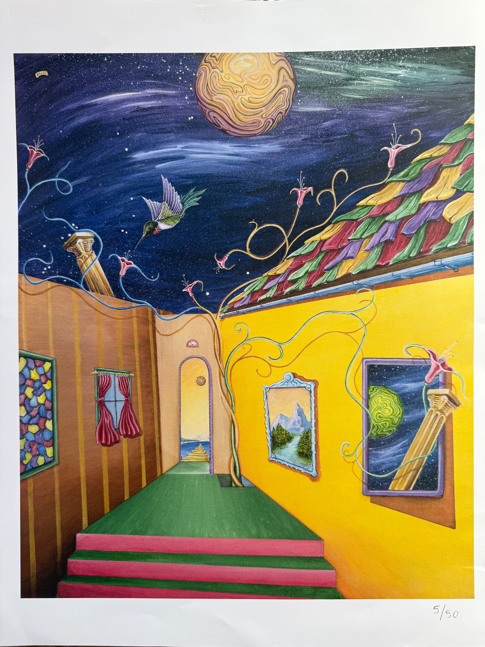 Take a trip through a universe of Pardis Flora. Each door and window is a passage to an another world in tangent to the one you’re walking through. This painting captures the essence of my life vine, Ever growing with new adventures and assemblages of shapes, images, hallways and entrances to the landscapes beyond the current realm.